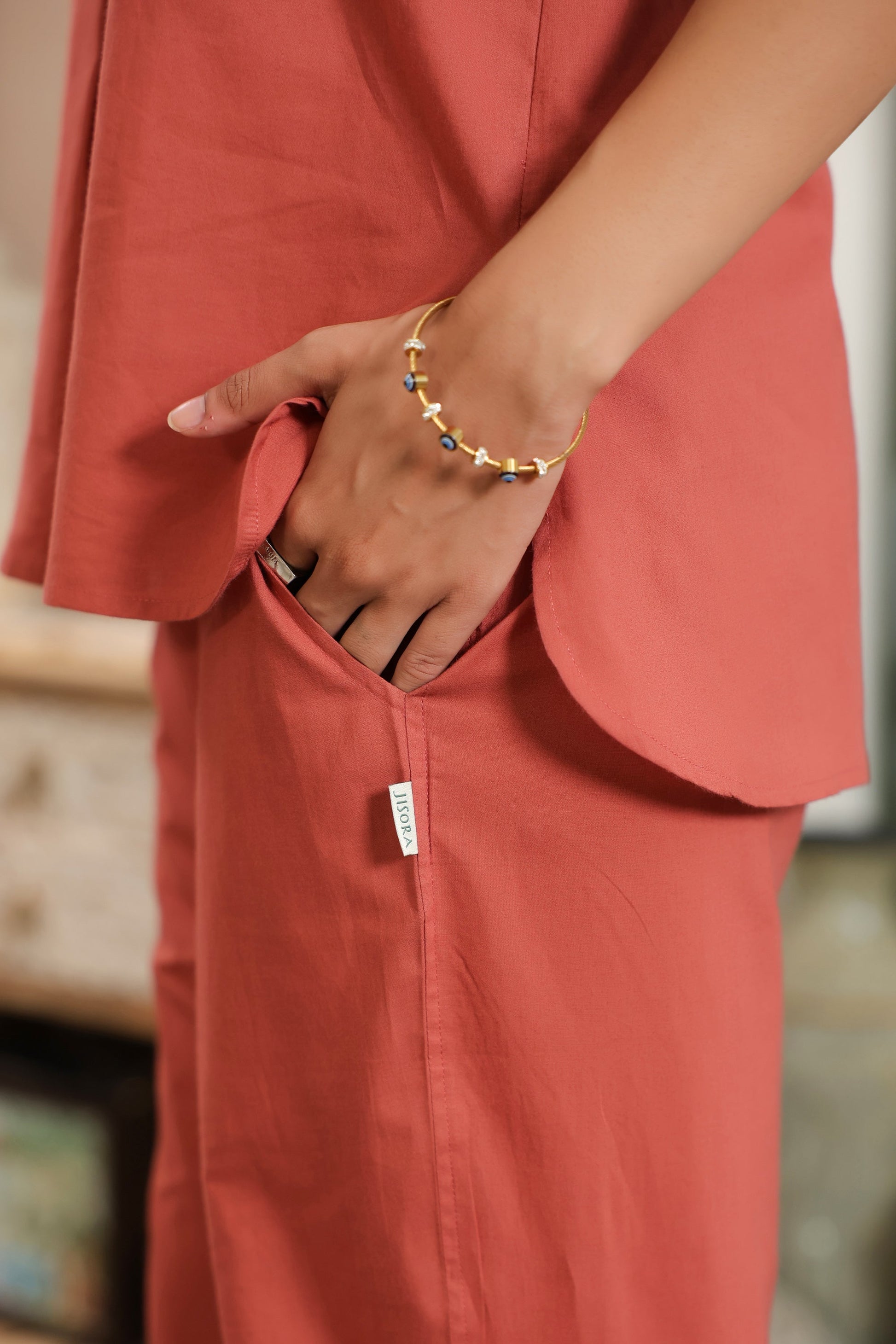 Turn heads with the warm and inviting Terracotta Solid Rust Sleeveless Co-ord Set. Its rich rust color and breezy sleeveless design make it a playful choice for sunny days and laid-back adventures. Comfortable and stylish, this set brings a joyful pop of color to your casual wardrobe.